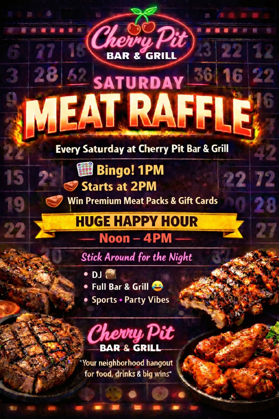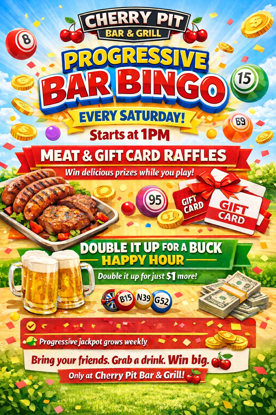 This Saturday! SATURDAY FUN STARTS AT 1PM! Grab your crew and come play Progressive Bar Bingo at Cherry Pit Bar & Grill Every Saturday at 1PM Meat & Gift Card Raffles Double It Up for a Buck Happy Hour Progressive Jackpot grows weekly! Bring your friends, grab a drink, and let’s see who’s yelling BINGO! Cherry Pit Bar & Grill #CherryPit #BarBingo #SaturdayFun #StillwaterMN #MeatRaffle#GiftCardGiveaway #WeekendVibes01:00 PM - 03:00 PM